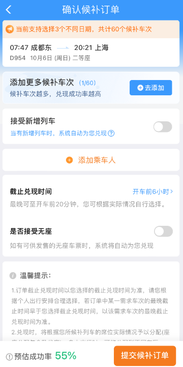 候补购票:如果心仪的车次车票已经售罄,可以尝试使用候补购票功能。