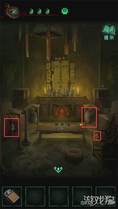 54、将梳子放在盆沿,铃铛挂在左边架子上,鼓放右架子上。然后点击中间红光处。