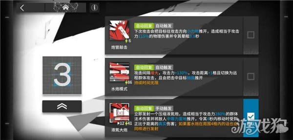 二技能类似煌的二技能,越早下越早启动,其实可以变向理解为一个减速效果,但会拥有更高的单次攻击伤害,攻击距离在专精下会再次加长,其收益大幅度提高,缺点就是攻击间隔的增大。