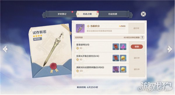 「归还奖励」领取回归奖励:在活动期间,可领取“原石” 、“脆弱树脂”等奖励,仅可领取1次。