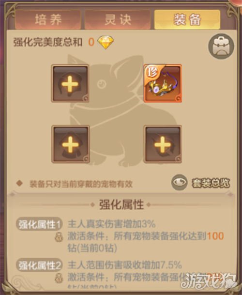 就像人物装备可以强化一样,宠物装备也是可以通过强化来直接提高装备的基础属性,并且当所有部位强化达到一定等级可以激活强化属性,部分套装激活有强化钻数要求。