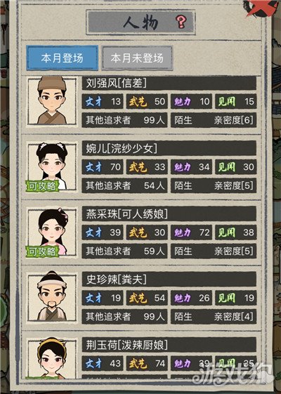 3.关于属性:文武不用说了,魅力去参加诗会,见闻去外出,带上老婆们加的更多,还有就是突发事件,文才 武力,魅力,见闻突发事件都有看运气。