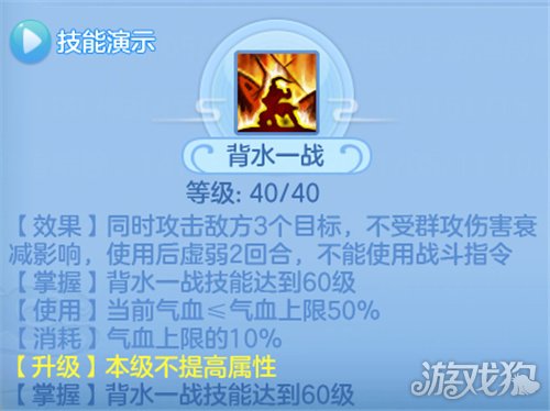 天策重要的一个群伤技能,可以攻击3个目标,适合残局时用来收割残血,背水一战使用之后需要休息并且降低抗性,通常都是自己血量较低的时候使用,使用之后的休息回合要么是补充状态,要么是躺地板。