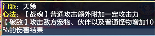 天策的门派心法特色普通攻击增加伤害,且对宠物、伙伴和怪物的伤害还能增加10%的伤害结果,而天策主要的输出方式都是单体物理攻击,所以天策在实际输出中可以非常好的享受攻击加成