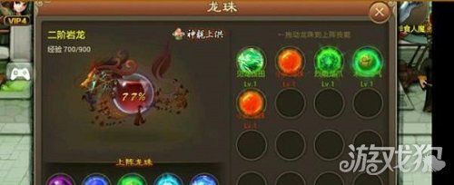 龙珠可以通过神龙上供获得,每天有20次普通上供的机会,每次上供需要消耗100万铜钱。此外,还可以花费50元宝和100万铜钱进行高级上供,高级上供获得高品质龙珠的概率更大。龙珠分为蓝、绿、紫、金四种,还有只能卖出的灰龙珠,灰色龙珠卖出可以获得10万铜钱。