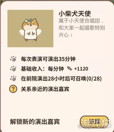小柴犬天使是前院草坪现场表演玩法的演出嘉宾,可以通过使用邀请卡邀请,但是是随机前来的。