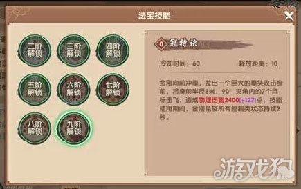 祭出法宝铃铛,悬于自己的头顶跟随,每秒摇动一次,对半径10米的范围内最多7个目标造成一定法术伤害,并且使其减少50%的移动速度,持续2秒。铃铛一共可以摇动7次,技能可在移动中释放。