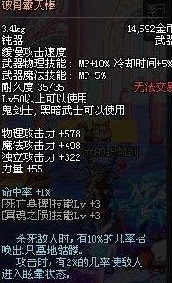 破骨霸天棒这把武器相对来说没有前面两把那么知名,原因在于它的属性没有很大亮点,只是在杀死敌人的时候有10%的几率召唤出1只墓地骷髅。为什么会召唤出骷髅?因为掉落这把武器的APC正是骷髅王。