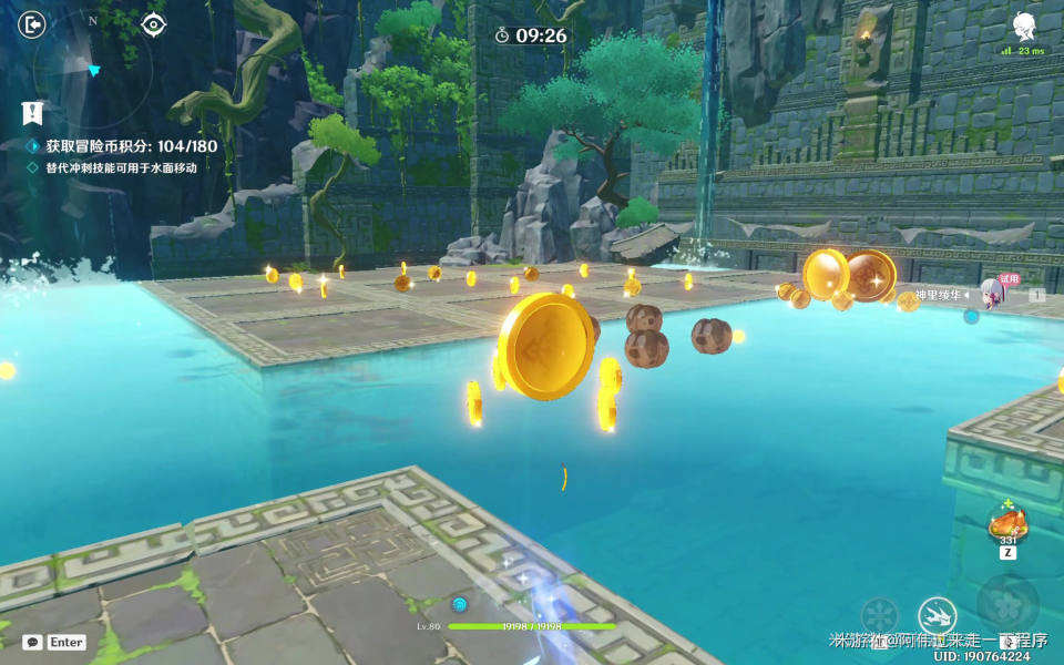 使用神里绫华的天赋技能代替冲刺在水面移动以获取金币。小心脏脏弹,被击中会遮挡视野。没体力了可以通过获取场上的光点来恢复。