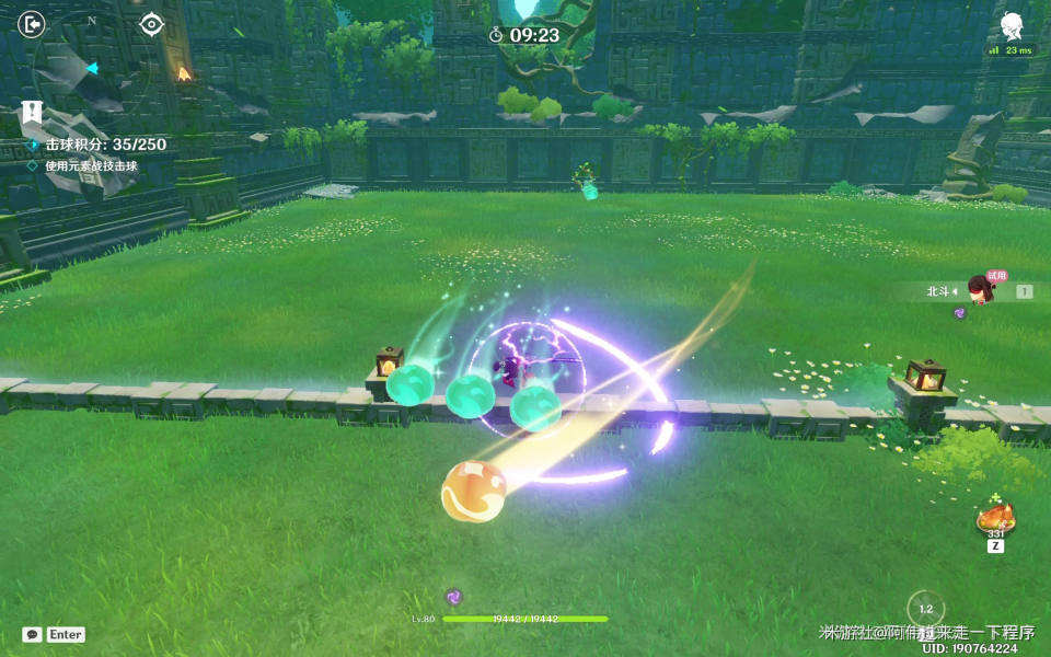 你将使用北斗的元素战技击中前来的弹球,击中每个绿色弹球得1分,击中每个金色弹球得3分。