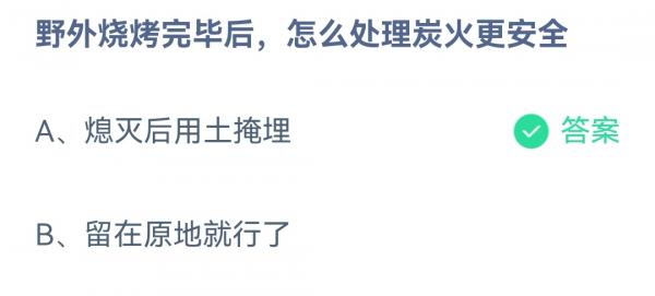 解析:烧烤活动结束后,熄灭炉火可先取一些水浇在木炭上,待火灭后将炭倒在土地上,确保火完全熄灭后,再用土将其掩盖好才可离去。