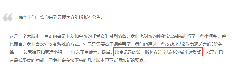 比赛记录就是俗称的战绩功能,这也是云顶之弈模式自从9.13版本上线以来,玩家就强烈呼吁的新功能。但之前由于设计师忙着新英雄、新羁绊、新装备和游戏机制的改动,就一直没有制作这个功能。而在新英雄卡莎和新装备拳套发布之后,云顶之弈第一赛季暂时告一段落。设计师在第一赛季的余下时间内,不会再发布新英雄这种大型的更新内容,他们已经在准备第二赛季的全新英雄和装备了。毕竟,如果每个赛季都是那些重复的英雄,玩家很容易就会厌倦。而设计师也是抽空制作了战绩功能,很有可能在下周上线正式服,不过目前测试服中已经可以体验到这个功能了。