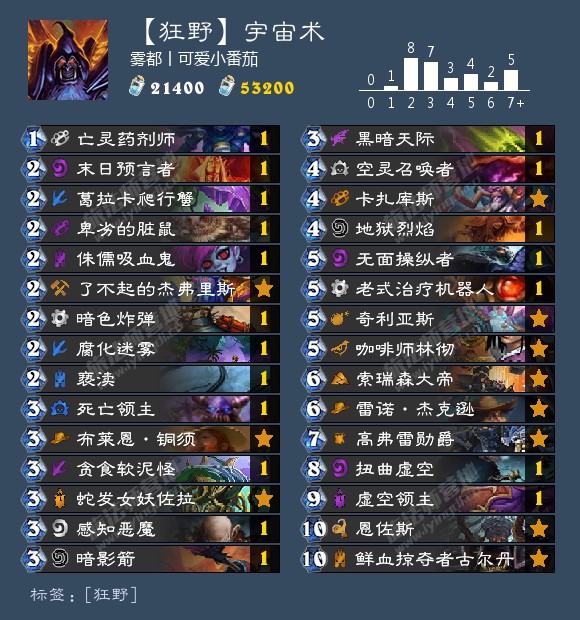 同时宇宙猎具有很强的快攻抗性,加入奥秘体系和焦油爬行者后面对海盗战奇数贼都非常强势,对阵宇宙任务法或是魔块术起手有缝合追踪者要留铜须,检索到姐夫塞布等核心牌是致胜关键。