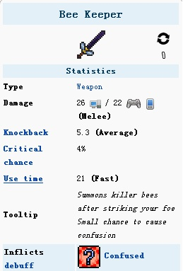 是唯一一件可以施加混乱debuff的武器,召唤的蜜蜂可以多次穿透攻击同一个敌人,蜜蜂在碰到液体或固体块时可能会被毁坏。