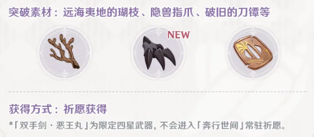 *「双手剑.恶王丸J为限定四星武器,不会进入「奔行世间J常驻祈愿。