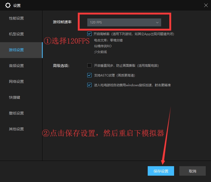 4、同时开启120FPS游戏帧速率,点击保存设置,重启雷电模拟器;