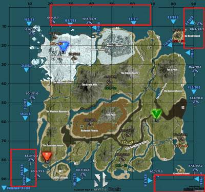 6、沧龙主要分布位置有4个地方:死亡岛、素食岛、北方和红色方舟海域,沧龙只会出现在深海中,所以往地图边缘寻找即可,位置见下图。
