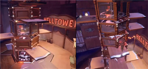 地狱之塔在【布谷钟楼】关卡开放世界的最左边,旁边有个“HELLTOWER”(地狱之塔)的灯光牌匾。如图所示这种塔楼,平台顺时针旋转,并且可以踩着平台往上跳,这种塔就是所谓的“地狱之塔”。