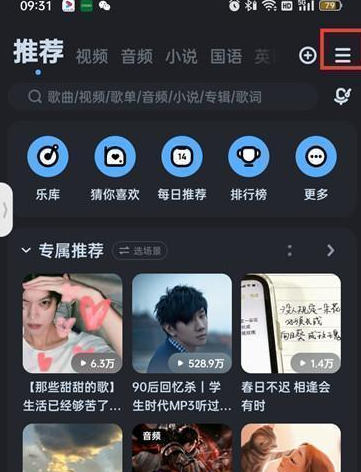 1.首先打开酷狗音乐软件,进入到酷狗音乐页面中点击右上角的【三横】图标;