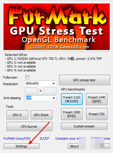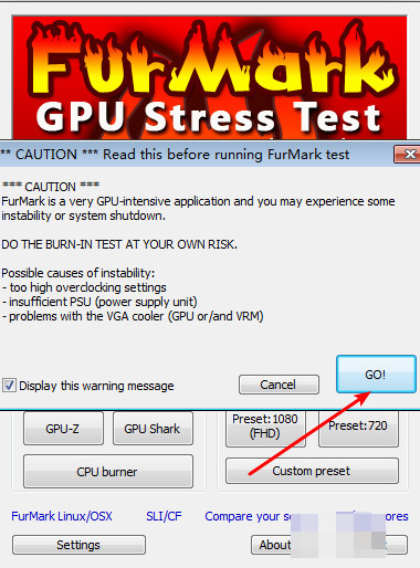 Furmark正确的烤机教程(图解) 网友整理 2023-04-11 20:33:15 Furmark是一款非常不错的显卡性能以及稳定度测试软件,通过这款软件可以快速测试出显卡的性能以及显卡是否稳定,本文中kk下载小编来给大家分享介绍下Furmark正确的烤机教程,希望大家会喜欢!Furmark正确的烤机教程1、打开软件,把图中红色区域设置为off,关闭抗锯齿功能,见下图所示:2、点击"Settings"这个设置,见下图所示:3、之后勾选图中2个选项,见下图所示:4、之后点击“ok”,见下图所示:5、点击“test”,见下图所示:6、点击“GO”,软件开始烤机了,见下图所示:以上便是kk下载小编给大家分享介绍的Furmark的拷机方法!