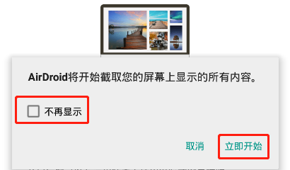 首次使用屏幕镜像功能时,手机上会出现一个弹窗提示"AirDroid将开始截取您屏幕上显示的所有内容”,请勾选“不再提示”,并点击“立即开始”。如果您的手机上没有出现弹窗提示,请到手机的设置内,设置>AirDroid>储存>清除数据,然后卸载并重新安装AirDroid