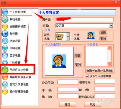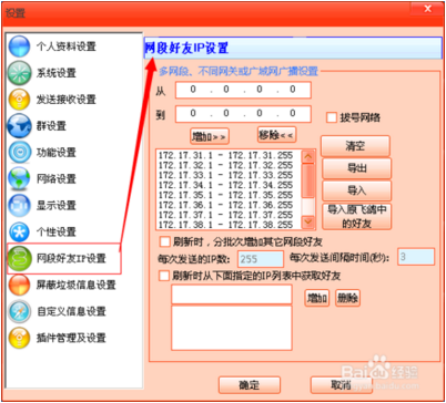 4、打开设置界面后,可以先修改一下自己的名称和组,默认用户名是电脑的登录用户,设置好后,选择左侧的“网段好友IP设置”,打开“网段好友IP设置”界面。输入你好友的网段地址,点击增加,如图所示:
