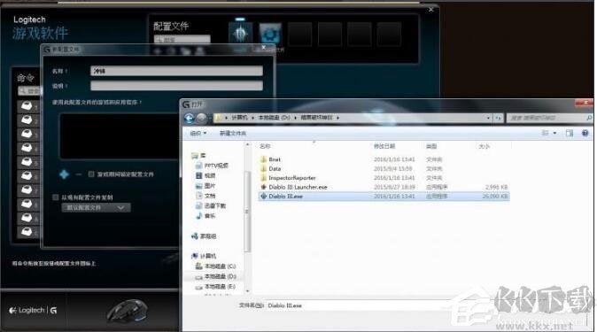 4、如:键位名称(随意)、设置次配置生效的程序,再选择暗黑3.exe文件。设置完成后点击确定;