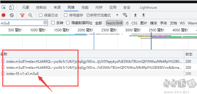 2、这时我们按下F12打开控制台,我用红色箭头指向的3个位置是需要修改的我这里是中文,可能跟你们显示的不一样,最上面的网络英文是Network,下面的m3u8(手动书写)是指定的意思,后面的中文英文都一样