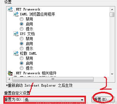 7、在安全设置页面内点击下方的重置自定义设置将级别设置为“中低”并点击“重置”后确定即可。