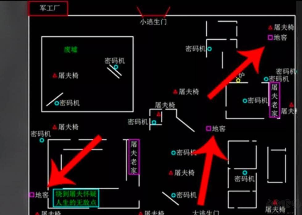 1,以军工厂为例,这个地图有三个地窖:一个在无敌房外围,一个在小木屋前的两个围墙之间,一个在中场四合院附件。