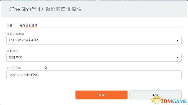 选择进阶启动选项,在“命令行参数”这一项中输入:-disablepacks:DLC, DLC,DLC...(图中我是屏蔽了EP03*)