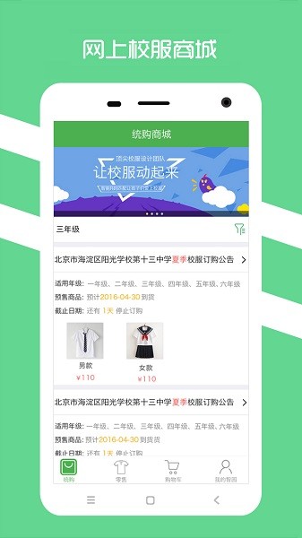 买个校服要记着报名?记着交钱?NO,使用阳光智园随时随地订购。点一点,坐等校服送到手