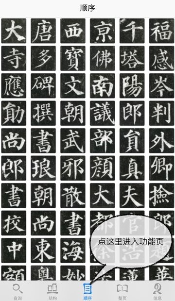 4、工具页提供“书法字典”功能,书法字典可控制朝代、字体范围,查询结果以碑帖为单元,点击进入单字页,罗列改碑帖同。