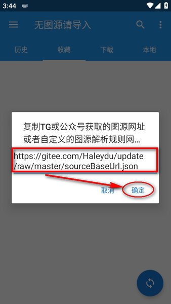 打开软件后,就会提示要导入漫画源,复制这个地址:https://gitee.com/Haleydu/update/raw/master/sourceBaseUrl.json,贴进去,然后点击“确定”;
