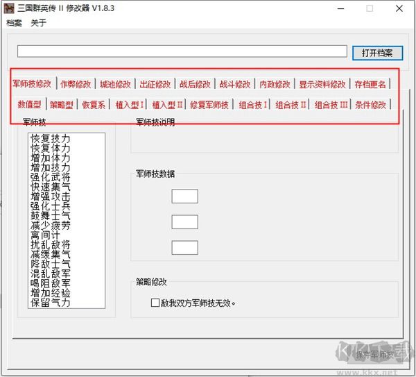 三国群英传2修改器是一款非常强大三国群英传2游戏全功能修改器,该修改器支持三国群英传2原版、楚汉英豪传、飞鹰版、煌星(水浒)版、风筝版、没有心情版、隋唐争霸、天使版、春天版、陈沐三国、路丰版、孤独战神、夏傲版以及修正版的存档修改,功能非常多如武将、城池、出征、战斗、技能等等应用尽有!是全网最强修改器。