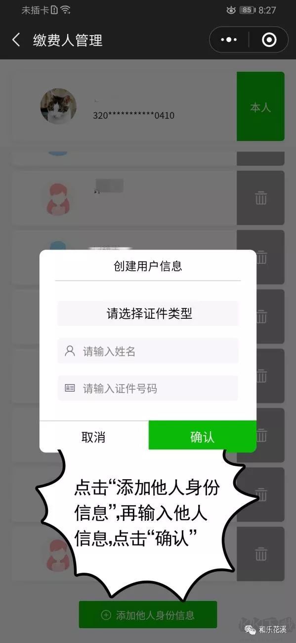 6、如需代他人缴费,则可通过右上角“切换缴费人”进入缴费人管理界面,此界面置顶的是本人信息,点击“添加他人身份信息”可录入他人信息,并切换至他人身份缴费。