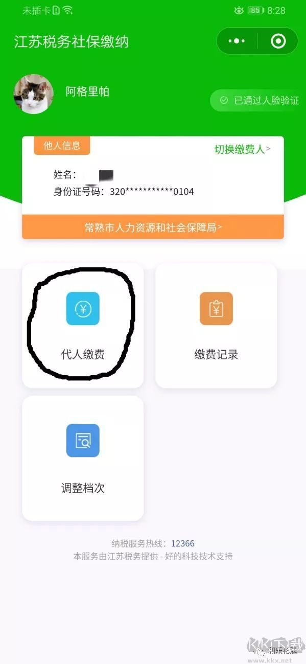 7、切换他人身份后,返回主页的效果如图所示。为了提示用户,此时“缴费”按钮已变为“代人缴费”。同时界面颜色也有所变化。