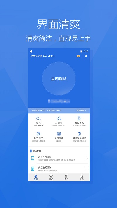 安兔兔致力于给用户提供一个全面、直观、易用的性能评测工具。安兔兔评测lite版为安兔兔评测的轻量版本,降低了跑分门槛,低配手机也可顺利进行测试流程。