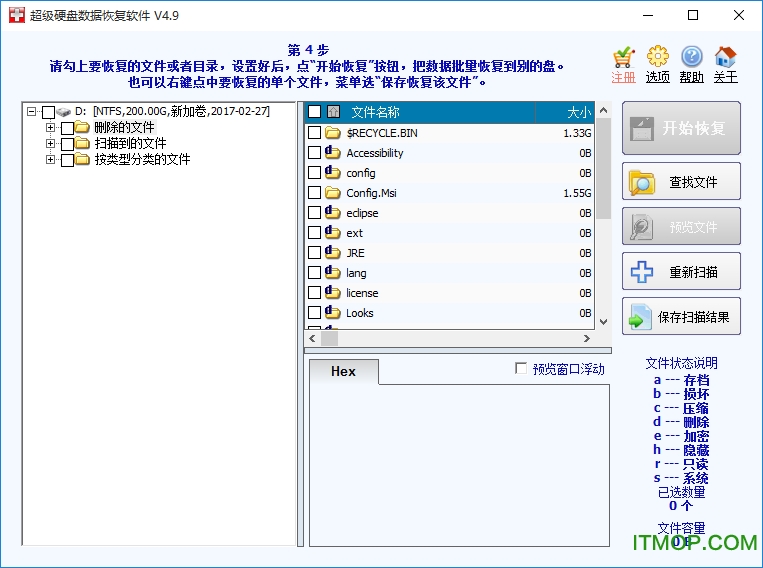 4、扫描完成,请勾上要恢复的文件或者目录,设置好之后,点击开始恢复按钮,把数据恢复到其它盘中,你也可以右键点击恢复单个文件,菜单选择“保存恢复该文件”。