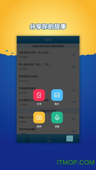 在app里,你可以很方便的和钓鱼翁几十万的钓友分享你的钓鱼趣事,分享你的精彩渔获。