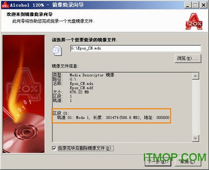 也许因为在【镜像文件信息】栏上面部分显示镜像文件的大小为“676.22MB”,在这你可能会担心镜像文件太大标准的“650MB”空白光盘无法写入 这么大的容量,其实不然,因为要判断我们要烧录的镜像文件大小,请看下面我们用桔色圈起来的地方“558.MB”,那才是真正镜像文件的实际容量.接着把 【烧录完毕后删除镜像文件】选上,点击【下一步】