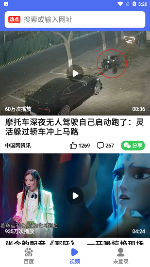 3、在主页底部,你可以快速进入视频频道,里面有大量明星娱乐、搞笑笑话和经典戏剧视频。