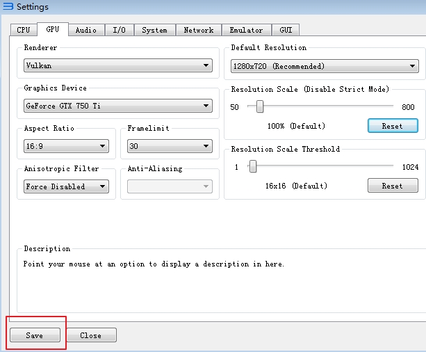 4.接着点击帧率这里,选择30fps,然后点击save。把游戏的帧数降低,可以获得更为流畅的体验。