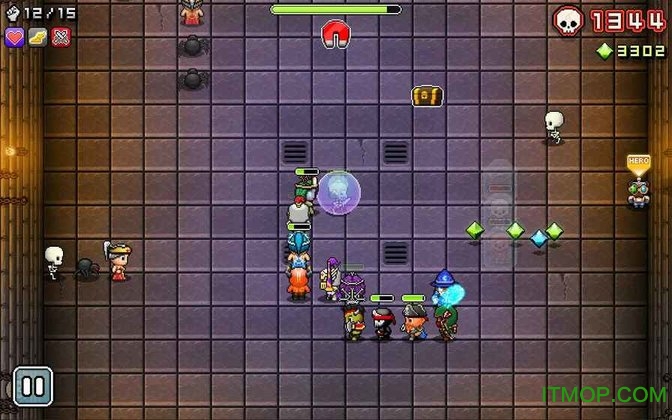 首次进入游戏,会直接开始教程,这并不是一个需要复杂操控的游戏,所以大概可以花5秒的时间通过教程弄懂这个游戏的方式:勇者们是无法停止的自走式存在,可以通过方向性的轻抚屏幕来控制他们的走向,场景中随机刷新出定点的敌人或者游荡的敌人小队,只要双方接近即会进入箭弩拔张的战斗.战胜敌人后会随机出现奖励的宝箱、道具或是同伴,新的伙伴会紧跟着队长战斗,队伍越来越长,实力越来越强,挑战也越来越大.特别的是,队伍中的勇者并没有主角光环,可以归纳为"柔弱生物",不仅血没了会死,碰到墙或是与敌人撞个满怀也会香消玉殒……队员死了充其量可以算个炮灰,队长挂了直接就是团灭,GameOver!所以切勿因队伍庞大而骄傲!