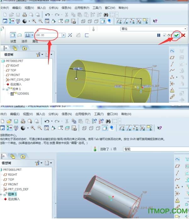 7、如图所示,可以在拉伸长度中输入你想要拉伸的长度,然后点击打钩符号完成圆柱的绘制。