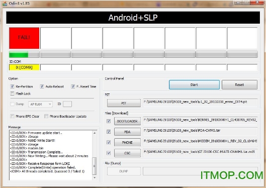 11、选择好以后,点击“开始刷机”,odin便会开始刷机,左上角有进度条显示。等待左上角显示“pass”,表示刷机已经完成;