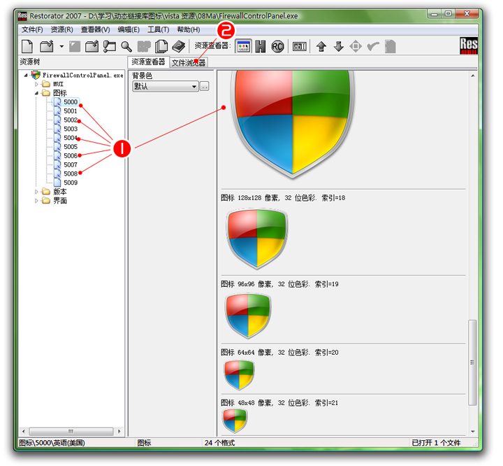 选中图标_5000,可以在资源查看器看到ICON的信息(红1),可以看出来这个文件的图标格式是比较多的,往下拉(红2)就可以看到RGB/A的图像信息,目前看到的是16色信息 。