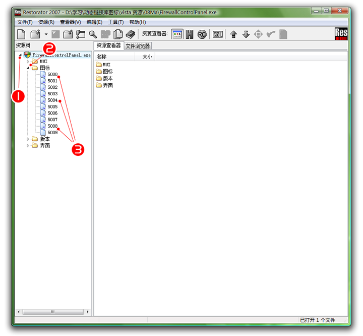 打开文件后,左侧资源树点击(红1)小三角拉开,把图标项也拉开(红2),现在看到(红3)的是该文件的包含的所有ICON,选中后可以看到图标的信息 。