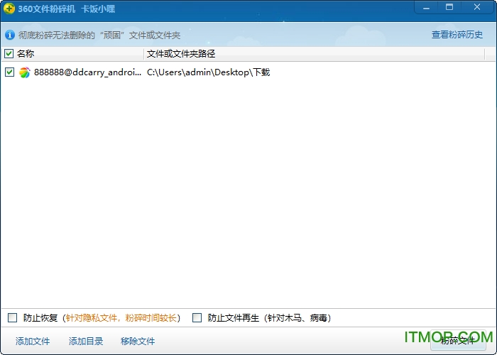 增加备份功能,在主界面选择“删除前备份为.bak文件”,删除文件后将生成一个同名的.bak文件备份。注意,如果将整个目录都拖入粉碎机粉碎,备份选项将失效!