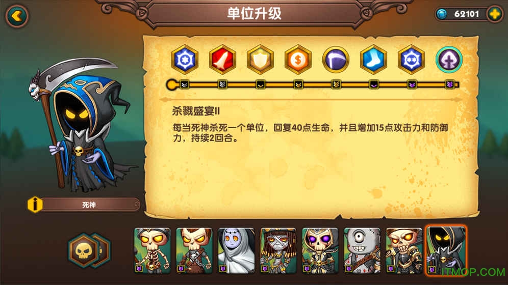 现有人族军团和亡灵军团,共16个单位,每个单位有自己独特的晋升路线,可以晋升8次.